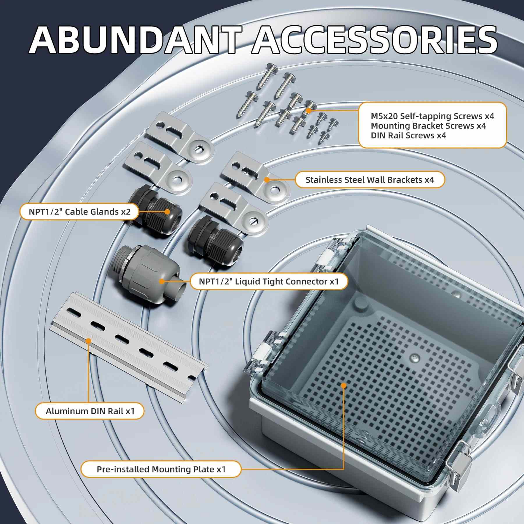 이 박스에는 안전한 폐쇄 및 장기 내구성을위한 강력한 스테인리스 스틸 래치가 있으며 포함 된 슬롯 형 알루미늄 DIN 레일은 스위치, 릴레이 및 회로 차단기와 같은 전기 부품의 장착을 단순화합니다. 고품질 ABS 플라스틱으로 제작 된이 인클로저는 가혹한 환경 적 요인을 저항 할뿐만 아니라 강력한 WiFi 신호 성능을 유지합니다.